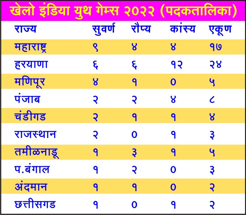 महाराष्ट्राने आत्तापर्यंत सर्वाधिक नऊ तर यजमान हरयाणाने सहा सुवर्णपदके मिळवली आहेत. योगासनांमध्ये महाराष्ट्राचे नेतृत्त्व करणार्या ध्रुव ग्लोबल स्कूलच्या योगसनपटूंनी राष्ट्रीय पातळीवरील खेलो इंडिया युवा स्पर्धेत केलेल्या सुवर्ण कामगिरीबद्दल ध्रुव ग्लोबलचे चेअरमन डॉ.संजय मालपाणी, व्हा.चेअरमन गिरीश मालपाणी व प्राचार्या अर्चना घोरपडे यांच्यासह अनेक मान्यवरांनी त्यांचे अभिनंदन केले आहे.