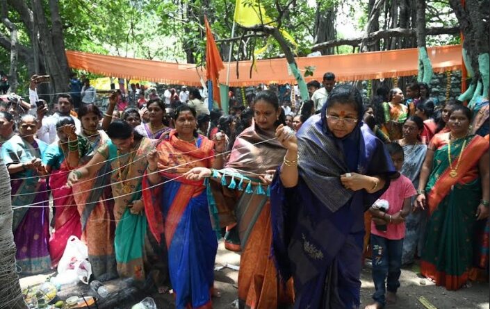 तालुक्यातील ऐतिहासिक पार्श्वभूमी असलेल्या पेमगिरी येथील महाकाय वटवृक्षाच्या सानिध्यात वटपोर्णिमा उत्साहात साजरी करण्यात आली, या निमित्त आयोजित कार्यक्रमात त्या बोलत होत्या. जाकमत बाबा तरुण मित्र मंडळ आणि संगमनेर तालुका महायुती महिला आघाडीच्या वतीने खास महिलांसाठी ‘उत्सव माझ्या कुंकवाचा, वटसावित्री पौर्णिमेचा’ या महिलांसाठीच्या विशेष कार्यक्रमाचे आयोजन करण्यात आले होते. यावेळी व्यासपीठावर आमदार अमोल खताळ यांच्या मातोश्री मंगल खताळ, पत्नी नीलम खताळ, पंचायत समितीच्या माजी सदस्या सुनिता कानवडे,वर्षा डुबे यांच्यासह अनेक महिला मान्यवर उपस्थित होत्या. हा कार्यक्रम यशस्वी करण्यासाठी जाकमत बाबा तरुण मित्र मंडळाच्या सर्व तरुणांनी विशेष परिश्रम घेतले.